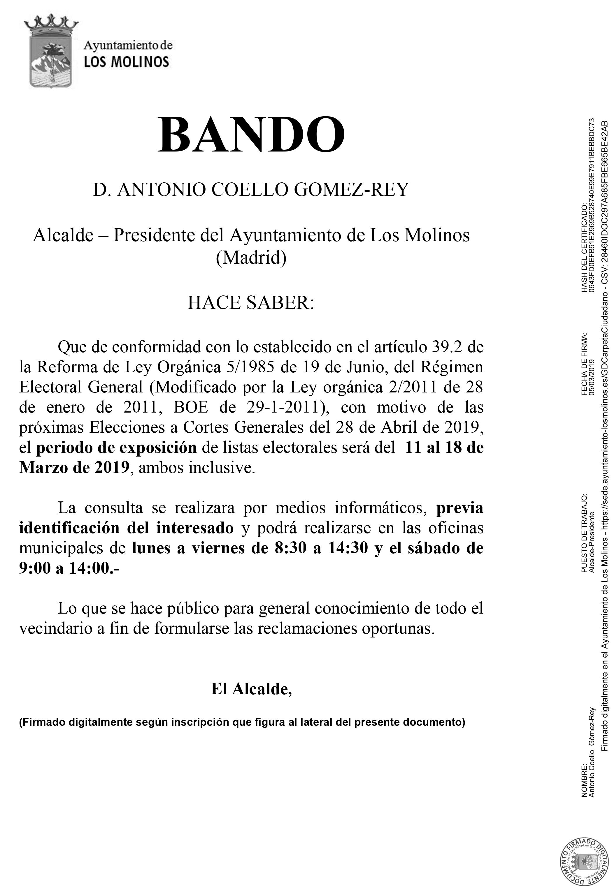 Con motivo de las próximas Elecciones a Cortes Generales del 28 de abril de 2019, el periodo de exposición de las listas electorales será del 11 al 18 de marzo de 2019. ambos inclusive.