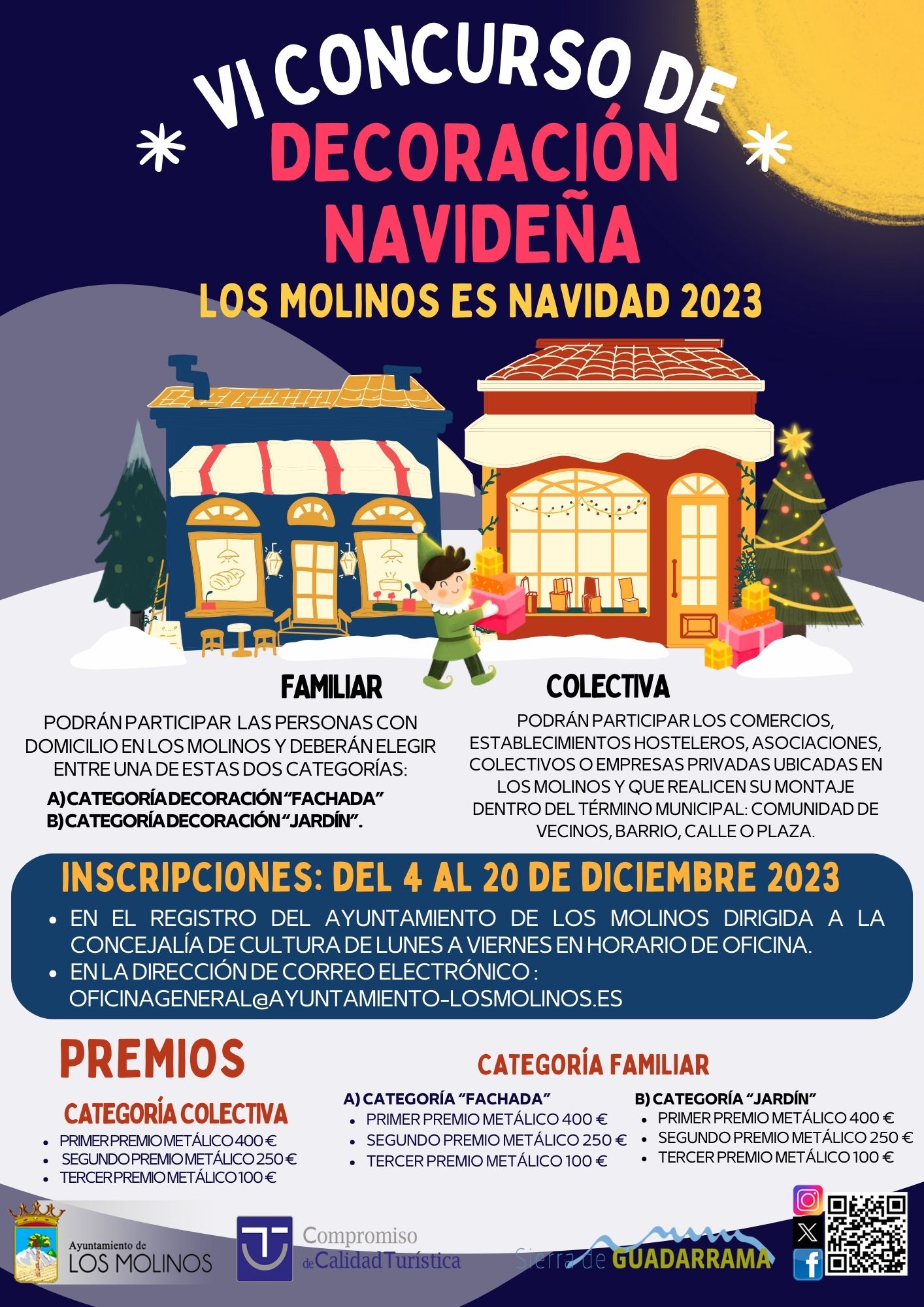 Por sexto año, el Excmo. Ayuntamiento de Los Molinos, a través de la Concejalía de Cultura, presenta el concurso de Decoración Navideña “LOS MOLINOS ES NAVIDAD”, dirigido a las asociaciones, peñas, colectivos y particulares del municipio de Los Molinos, con los siguientes fines: