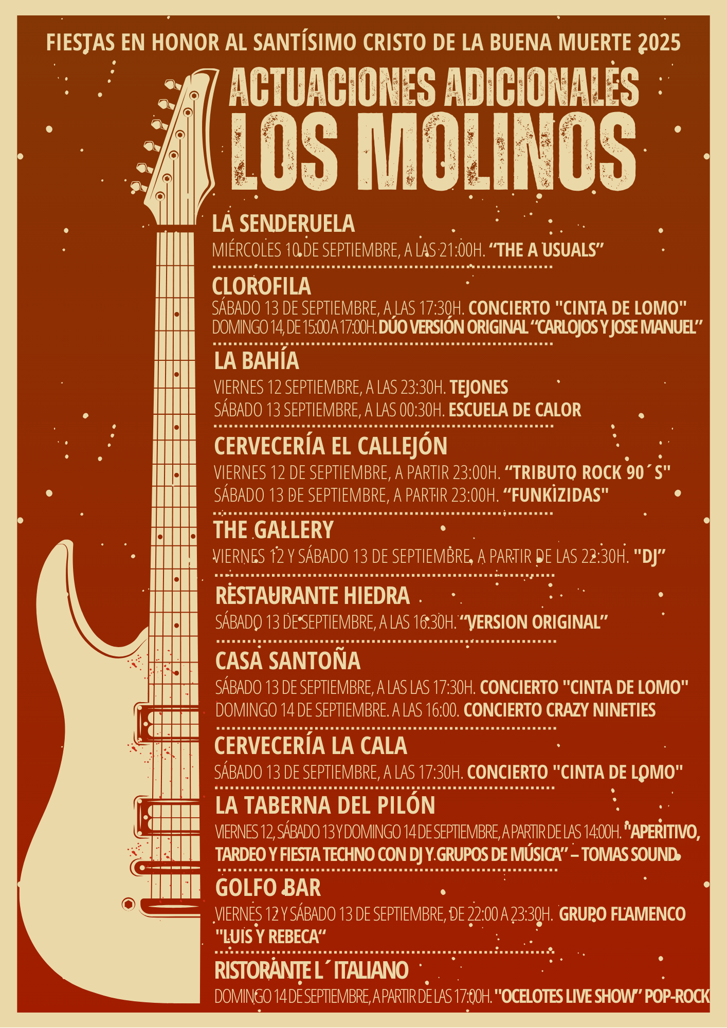 El Ayuntamiento, junto con las asociaciones, peñas, hermandades y voluntarios, ha preparado un amplio programa que combina tradición, cultura, música y deporte, con el objetivo de que Los Molinos vuelva a ser punto de encuentro y de celebración.