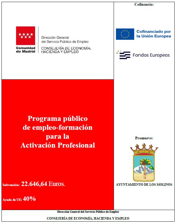 El Ayuntamiento de Los Molinos, en su compromiso con la promoción del empleo y la mejora de la empleabilidad en el municipio, ha obtenido dos subvenciones de la Consejería de Economía, Hacienda y Empleo de la Comunidad de Madrid destinadas a fomentar la inserción laboral de personas desempleadas, especialmente jóvenes, a través de los Programas FSE+ de Activación Profesional 2025.
