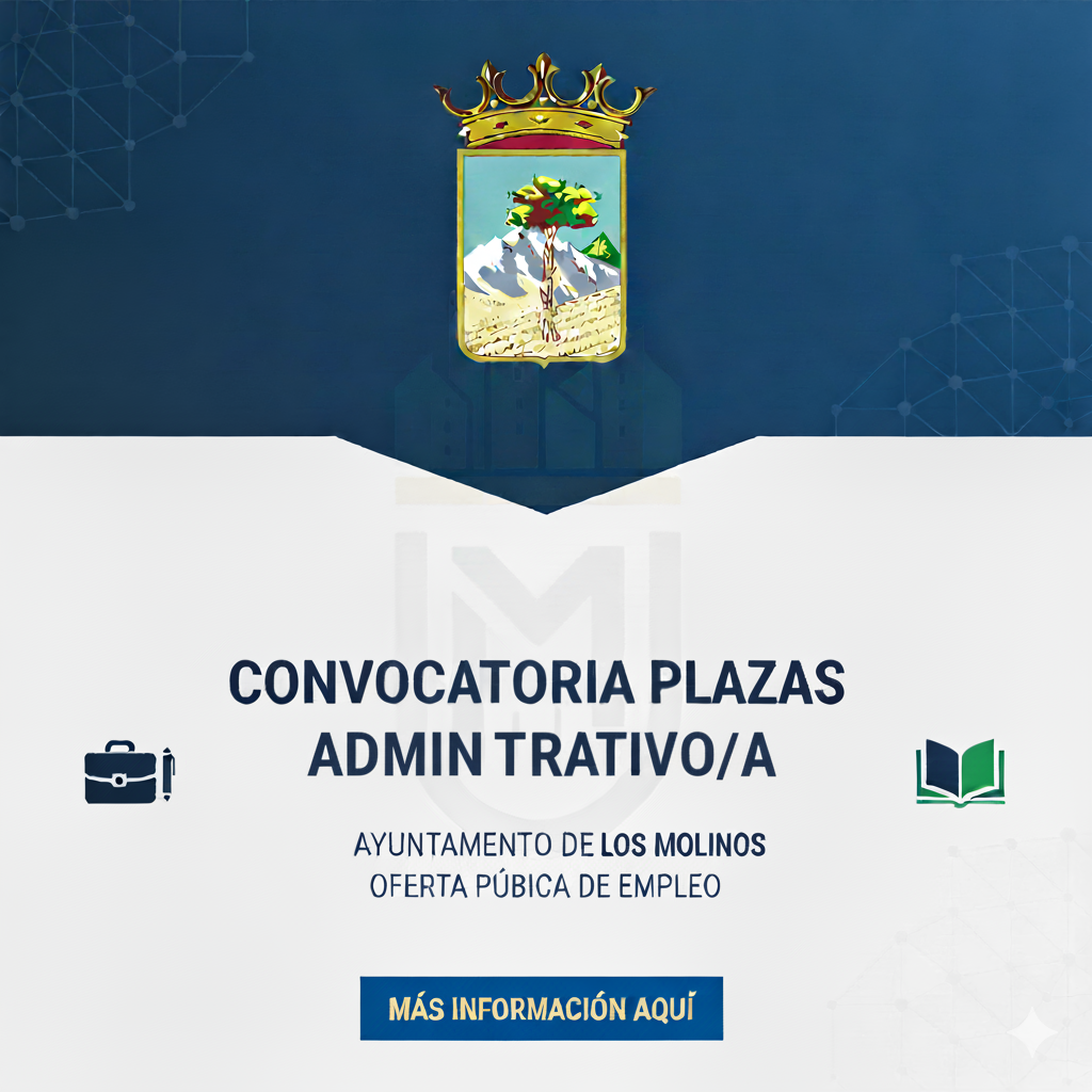 El Ayuntamiento de Los Molinos ha anunciado la publicación de las bases y la convocatoria para cubrir dos plazas de Administrativo/a de Administración General (Grupo C, Subgrupo C1), correspondientes a la Oferta de Empleo Público de 2025.