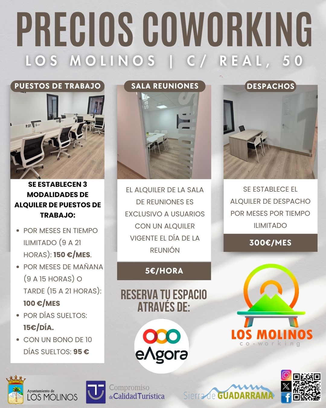 El Ayuntamiento de Los Molinos informa sobre las nuevas tarifas del espacio de coworking situado en la Calle Real, 50, un recurso pensado para emprendedores, autónomos y profesionales que buscan un entorno colaborativo, moderno y flexible para desarrollar su actividad.