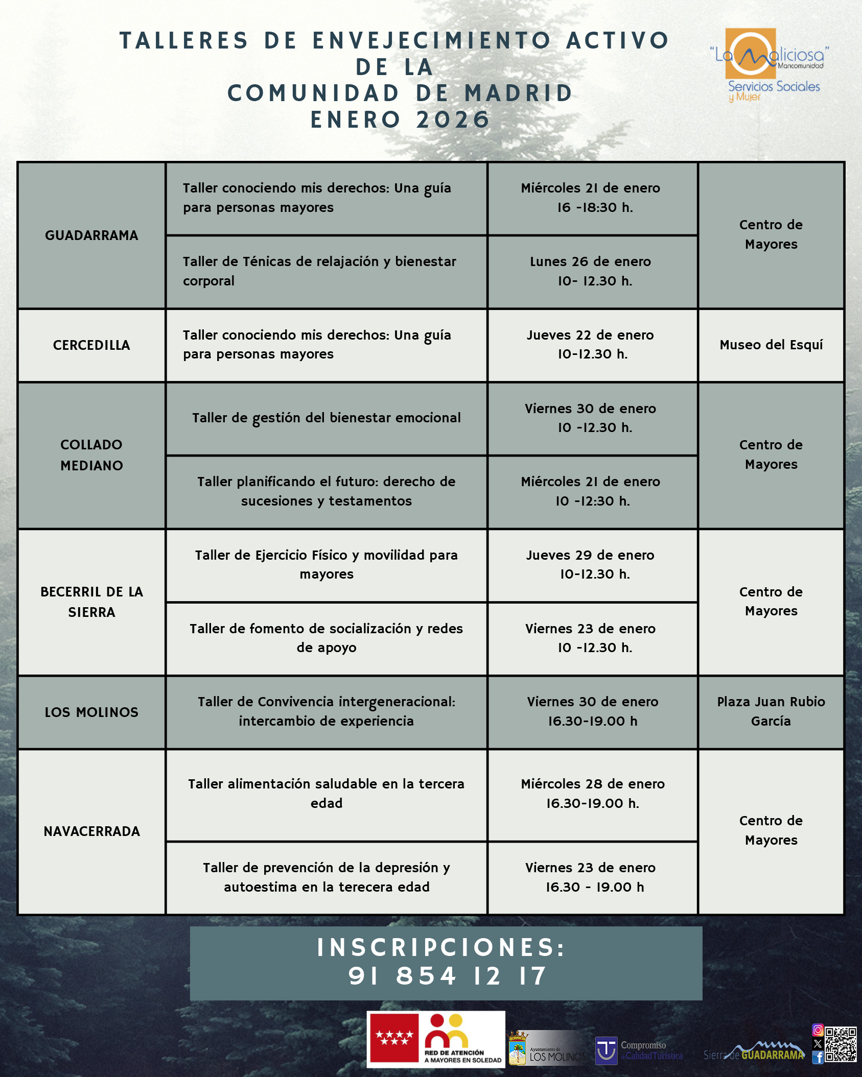 El programa de Envejecimiento Activo ofrece una amplia variedad de talleres gratuitos orientados a promover el bienestar físico, emocional y social de las personas mayores. Entre los contenidos se incluyen sesiones sobre derechos de las personas mayores, bienestar emocional, ejercicio físico, alimentación saludable, prevención de la depresión, socialización y convivencia intergeneracional, desarrollándose en municipios como Guadarrama, Cercedilla, Collado Mediano, Becerril de la Sierra, Navacerrada y Los Molinos.