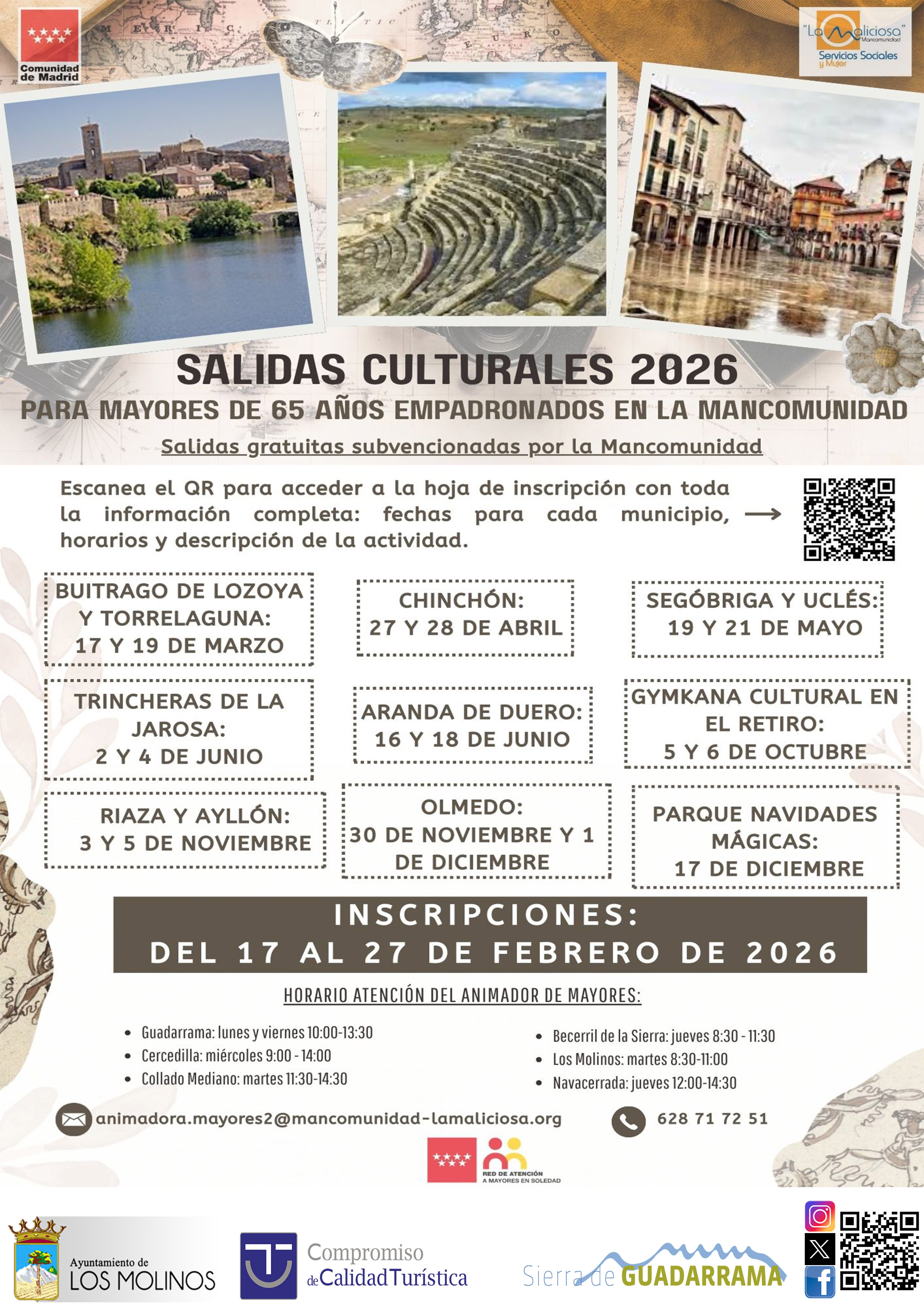 Las inscripciones permanecerán abiertas del 17 al 27 de febrero de 2026 y podrán realizarse a través del servicio de animación de mayores. En el municipio de Los Molinos, la atención se prestará los martes en horario de mañana, facilitando información sobre fechas, horarios y características de cada excursión.