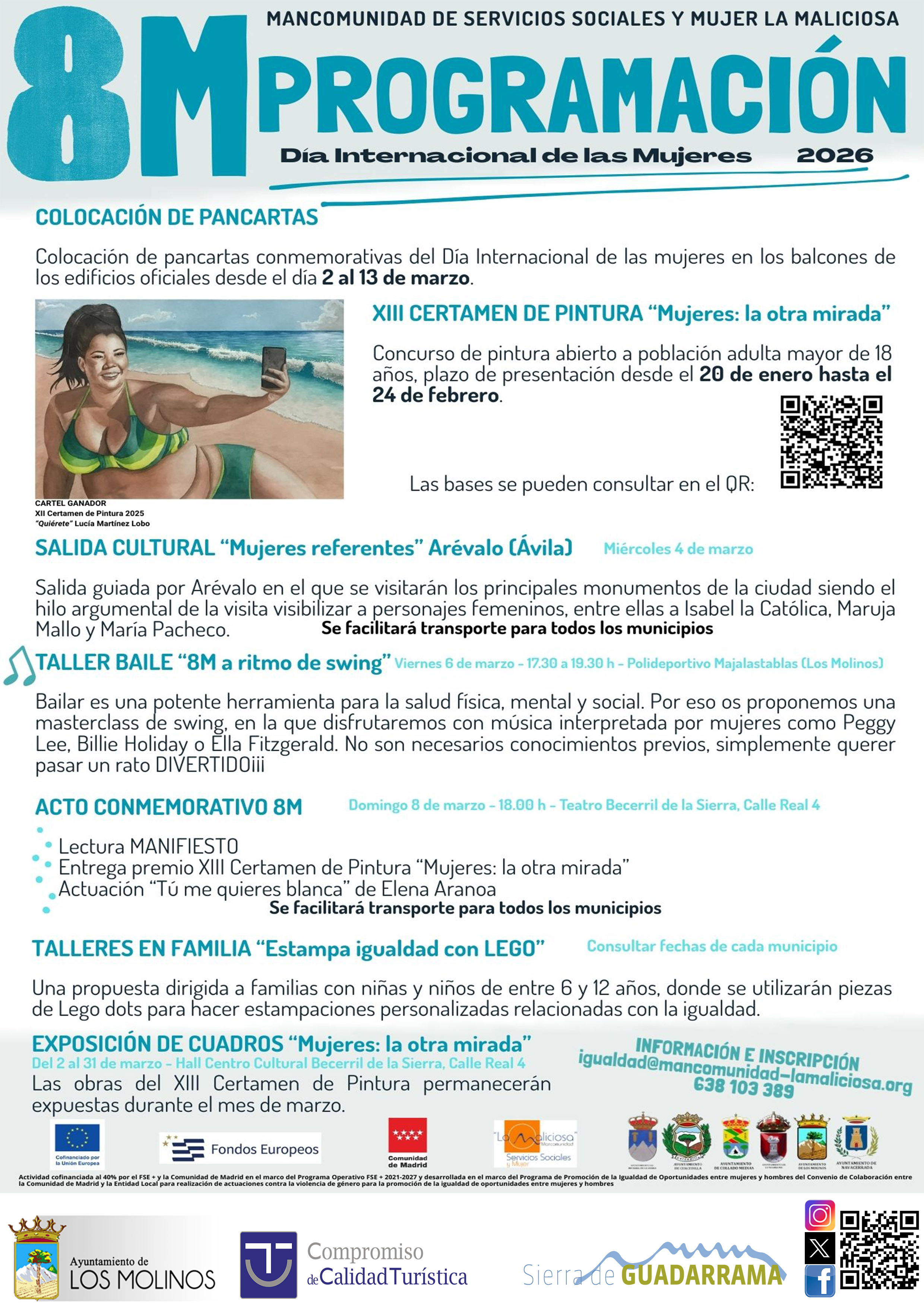 El Ayuntamiento de Los Molinos, a través de la Mancomunidad de Servicios Sociales y Mujer “La Maliciosa”, presenta el calendario de actividades para conmemorar el Día Internacional de las Mujeres 2026.
